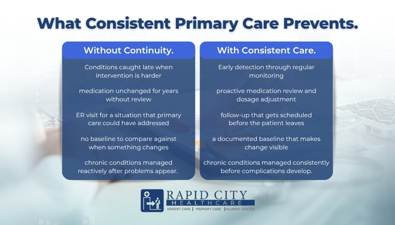 With consistent care at Rapid City Care, that same patient leaves the urgent visit with a follow-up scheduled. At the follow-up, the provider has context. HbA1c gets tracked over time. Medication gets reviewed. Complications get monitored for. The management is proactive rather than reactive, and the difference in long-term outcomes is meaningful.