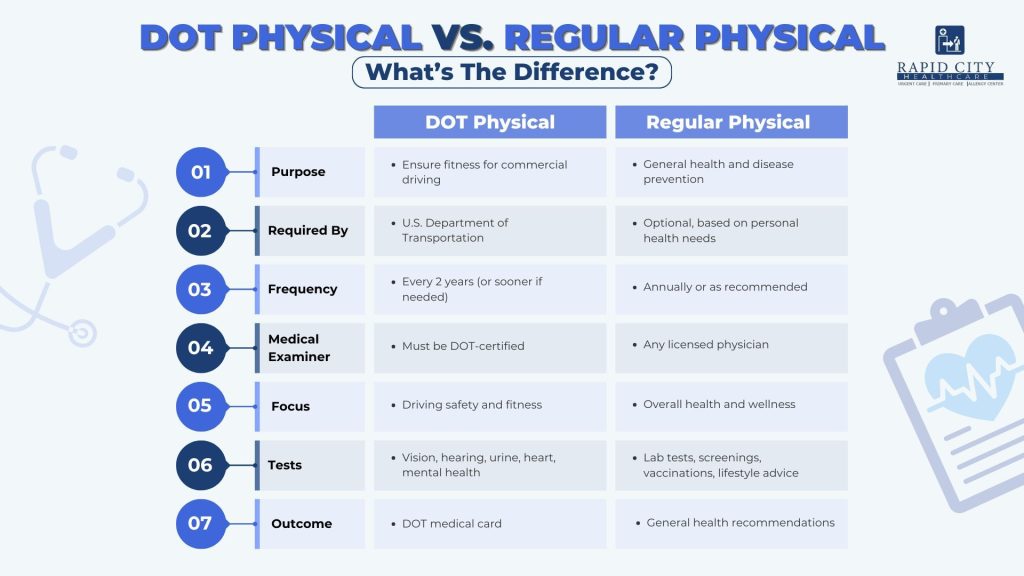 A DOT physical focuses on driving safety and compliance with federal regulations, including vision, hearing, and mental health checks. A regular physical focuses on overall health, disease prevention, and wellness.